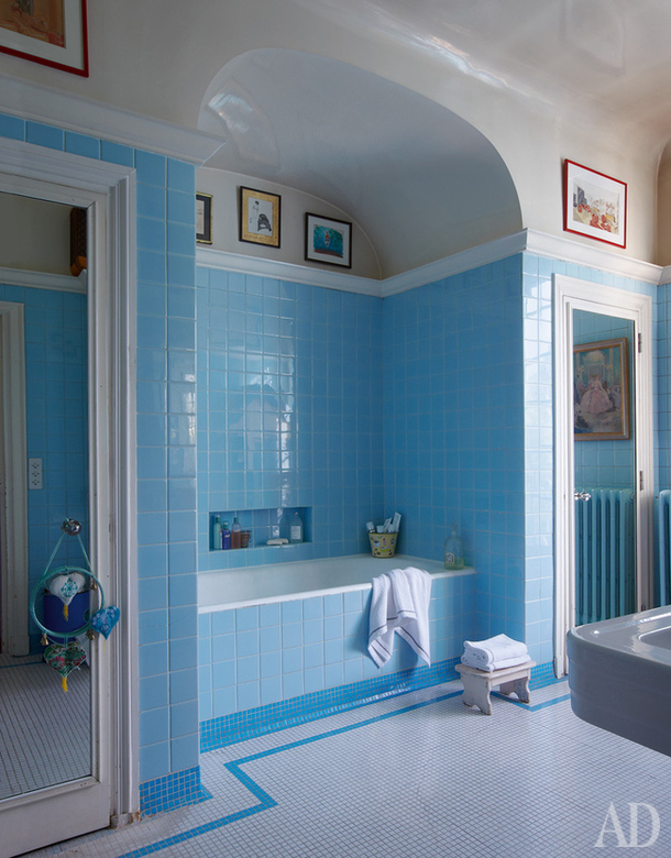 Современная ванная вписана в архитектуру дома XVIII века. Ванна точно встала в альков, а симметричные выгородки по бокам скрывают самые интимные зоны санузла. Архитектура здесь настолько выразительная, что даже практичная облицовка стен из голубого кафеля не разрушает исторический облик интерьера.