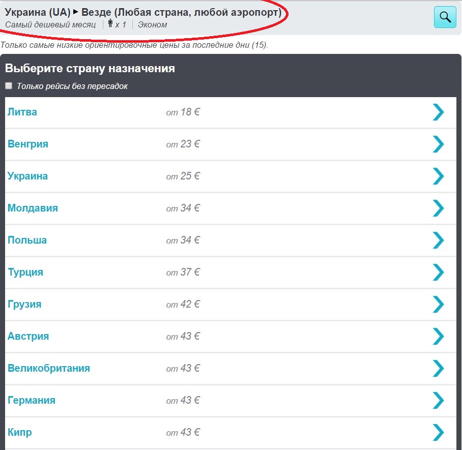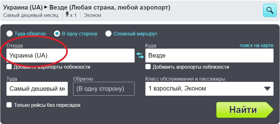 Если в окне места вылета «Откуда» указать не город, а страну…