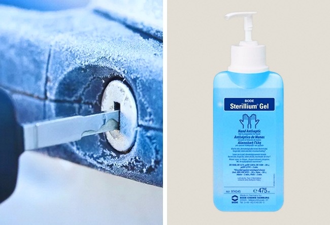 Если замочная скважина уже заледенела, то можно впрыснуть в неё средство для дезинфекции рук и нанести его же на ключ. Тогда всё пойдёт как по маслу.