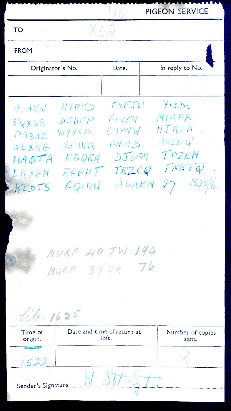 В 2012 году в дымоходе дома в графстве Суррей нашли останки почтового голубя времён Второй мировой войны, а вместе с ними — капсулу с зашифрованным сообщением. Судя по всему, птица погибла во время выполнения задания, и её депеша так и не была доставлена адресату: текст на тонкой бумаге представлял собой набор буквенных и цифровых групп, характерных для военных шифров того времени.