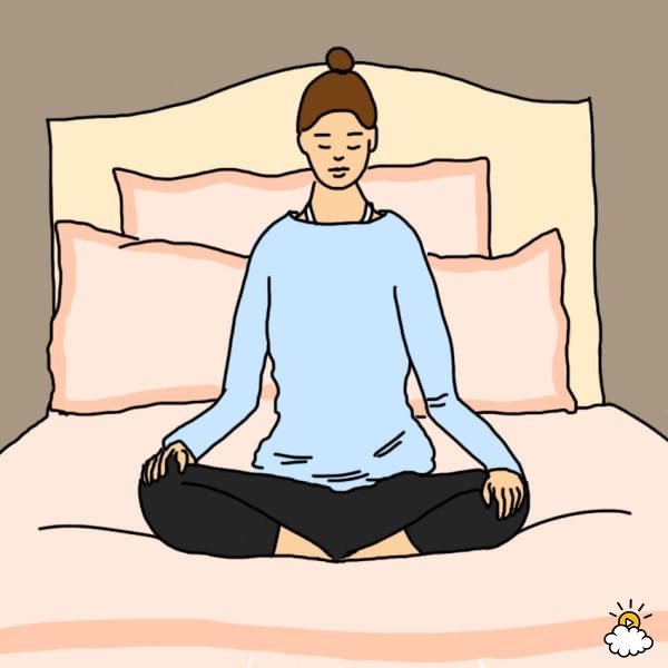 Сядьте удобно, скрестив ноги на кровати. Сядьте так, чтобы потянуть позвоночник, расслабьте руки и сделайте три глубоких вдоха. Старайтесь изо всех сил очистить свой ум и сосредоточиться на глубоком дыхании. Успокоение ума может занять некоторое время.