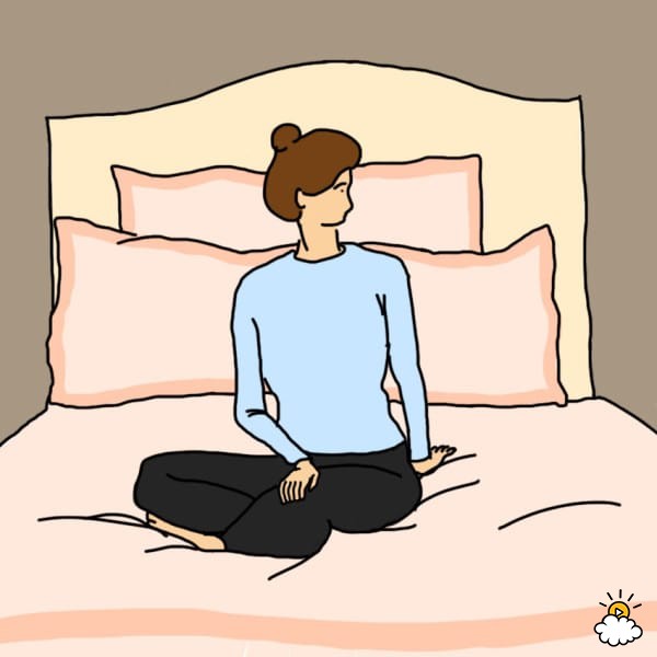 Эта поза действительно творит чудеса, растягивая позвоночник и верхнюю часть тела. Начните сидя со скрещенными ногами на кровати, и положите правую руку на левое колено.