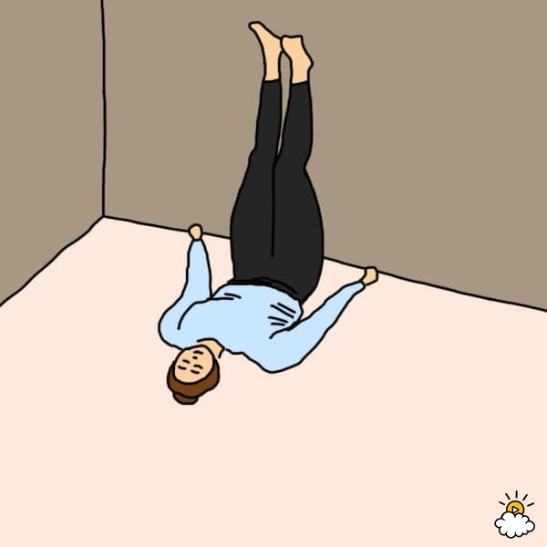 Сядьте на кровать лицом к стене. Лягте и вытяните ноги вверх на стену. Пусть руки отдыхают по бокам, ладонями вверх. Дышите мягко, и почувствуйте растяжение в задней части ног.