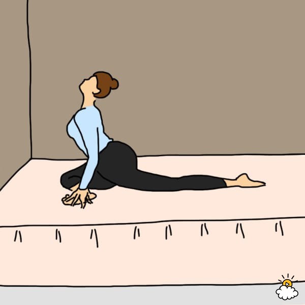 Встаньте четвереньки, руки на ширине плеч. Выставьте левое колено вперед перед руками, и вытяните правую ногу позади вас на кровати. Выдохните, наклоните свое тело вперед к левому колену.