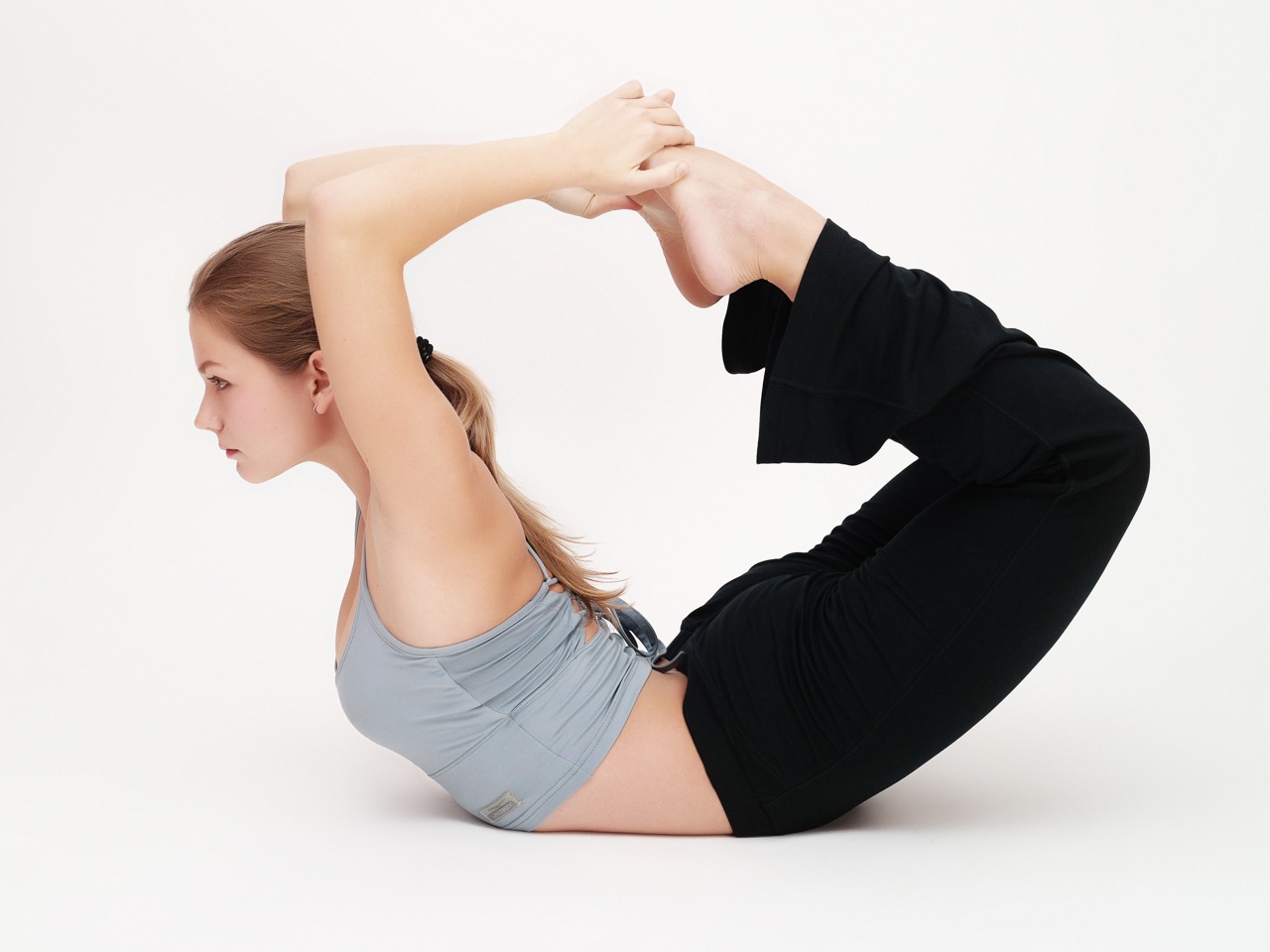 - Лечь на живот, согнуть колени, поднять вверх голени, завести руки за спину и захватить одноименными руками лодыжки (с внешней стороны).