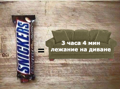 Примеры такого народного творчества заставляют думать бедных людей, не очень разбирающихся в фитнесе, будто бы если не пробежал непосредственно после съедения «Сникерса» необходимое количество километров (причем, для каждого человека это будет разное количество км, ну да ладно), то все не сожжённое сразу же отложится жиром на боках: