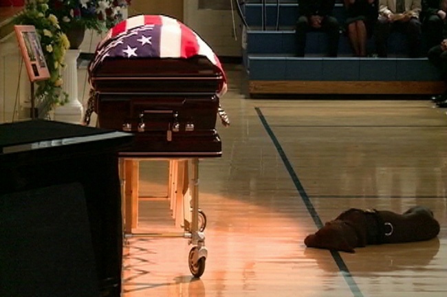 Собака погибшего военного лежит у его гроба на похоронах в Рокфорде, штат Айова. 19 августа 2011 г.