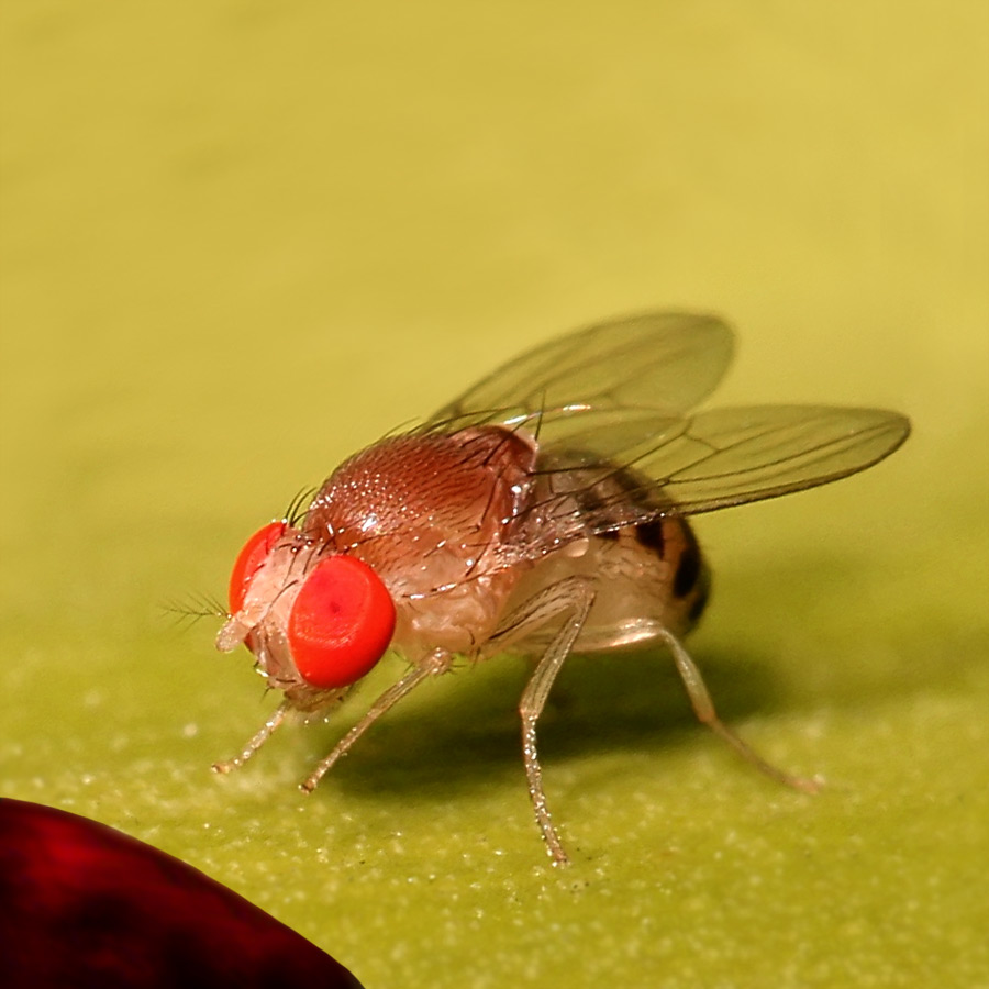 Плодовые мухи дрозофилы могут переносить высокие дозы излучения — примерно до 64000 рад. Если упомянутые выше тараканы получают возможность выжить при ядерной войне благодаря медленному делению клеток, дрозофилы имеют другой козырь. Они очень быстро размножаются и имеют всего 8 хромосом.